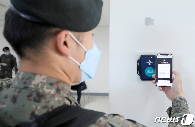 (전주=뉴스1) 유경석 기자 = 신종 코로나바이러스 감염증(코로나19) 확산 방지를 위해 통제됐던 장병들의 휴가가 정상 시행된 8일 전북 임실군 35사단에서 한 장병이 부대를 나서기 앞서 '국방 모바일 보안' 앱 해제를 하고 있다. 2020.5.8/뉴스1