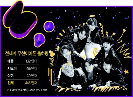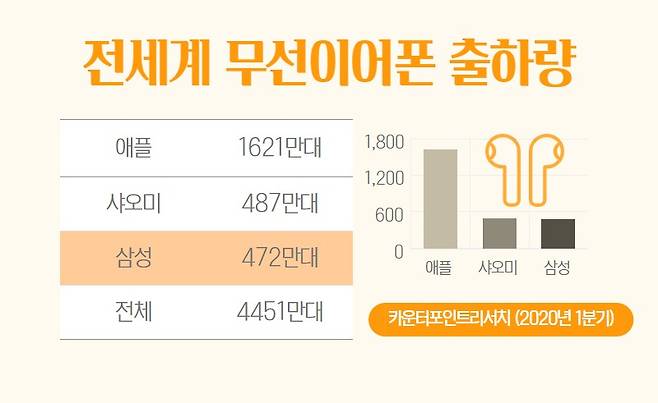 무선이어폰시장은 코로나19에도 큰 폭으로 성장했다. 시장조사업체 카운터포인트리서치에 따르면 올해 1분기 무선이어폰 출하량이 4500만대. 지난해 1분기 출하량(1750만대)과 비교해 무려 157% 급성장했다. 애플이 독보적인 1위 자리를 굳히고 있지만, 삼성전자도 맹추격하고 있다. 삼성전자는 같은 기간 8%에서 11%로, 3%포인트 판매량이 올랐다.