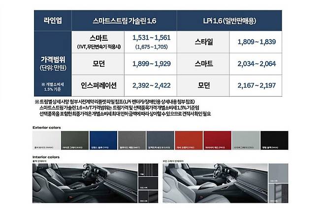 신형 아반떼 가격은 기존 아반떼의 1.6 가솔린 1376만원, 1.6 LPi 1656만원에서 시작되는 가격 대비 각각 155만원, 153만원 인상됐다. 강화된 안전사양을 고려하면 적절한 수준이나 과거 제공되던 스마트 초이스와 같은 가성비 트림 삭제로 체감 가격은 높아졌다.