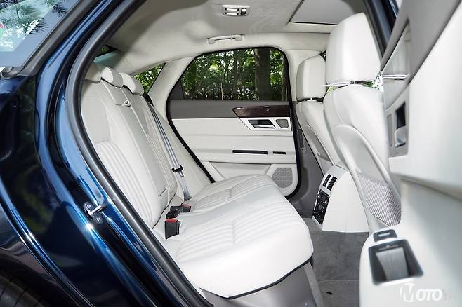 재규어 XF는 낮은 루프 라인을 가지고 있어, 뒷좌석이 다소 걱정스럽게 보일 수 있다. 하지만 실제로 뒷좌석에 올라 보면 외견에 비해 그다지 부족하지는 않은 공간을 경험할 수 있다. 뒷좌석의 시트 포지션을 약간 낮게 만들고 천장 안쪽을 파내 헤드룸을 확보한 것으로 보인다. 레그룸은 동급의 E세그먼트 세단들과 비교했을 때 충분한 수준이다. 하지만 창의 크기가 작은 편이기 때문에 탑승자에 따라서는 답답한 느낌을 받을 수도 있다.