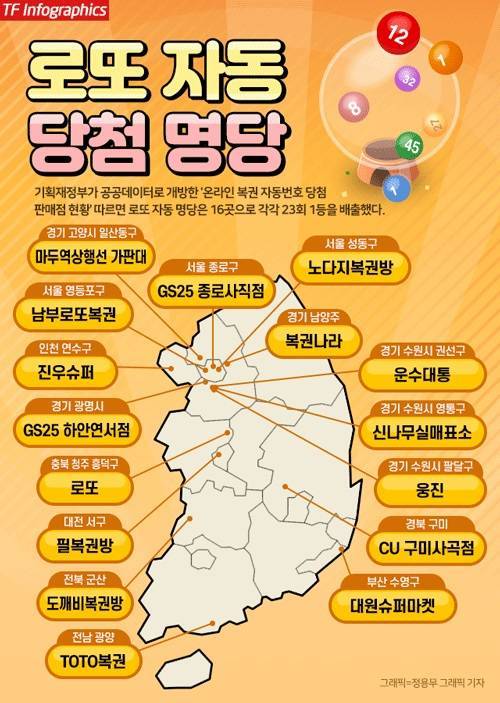 정부는 전국 로또 판매점 중 자동 1등 당첨만 23차례 나온 '명당' 16곳의 명단을 18일 공개했다. 전국 로또 판매점 가운데 1등(자동) 당첨건수가 15차례 이상인 곳은 모두 308곳이다. 이는 로또복권 1회차 추첨부터 911회차인 올해 5월16일까지 당첨 현황을 누계한 결과다.