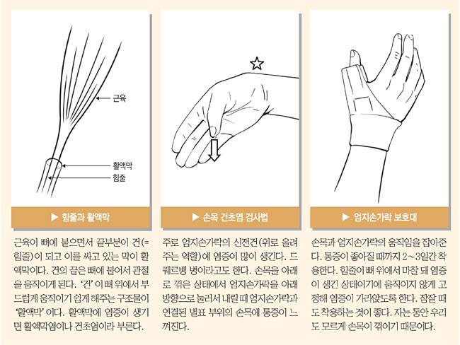 손을 많이 써서 힘줄에 염증이 생긴 것을 '건초염'이라고 하며, 엄지손가락 쪽 손목 힘줄에 염증이 생긴 것을 '드퀘르뱅 건초염'이라고 합니다.