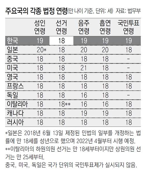 소년법이나 국민투표도 성인·선거 연령과 궤를 같이한다. 영국 프랑스 이탈리아 캐나다 러시아 등 5개 국가는 성인 연령인 만 18세부터 소년법 대신 성인과 같은 형사법의 적용을 받는다. 국민투표권도 만 18세부터 부여한다.