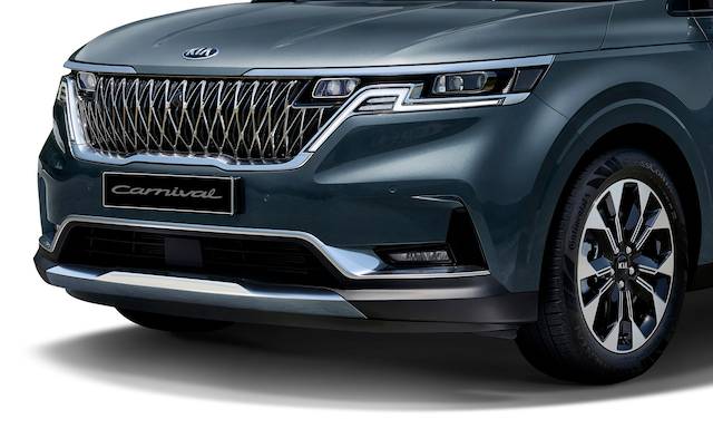 신형 카니발 얼굴은 오케스트라 지휘자의 퍼포먼스를 모티브로 완성한 심포닉 아키텍쳐(Symphonic Architecture) 라디에이터 그릴이 달린다. 라디에이터 그릴은 헤드램프와 경계 없이 조화롭게 연결된다. 주간주행등은 박자와 리듬을 시각적으로 형상화한 모습을 도입했다. 에어 인테이크 그릴과 에어 커튼은 라디에이터 그릴과 조화를 이루면서 범퍼 하단을 가로지르는 크롬 가니쉬와 대비된다. 캐릭터 라인으로 볼륨감을 더한 보닛, 범퍼 디자인은 미래지향적인 이미지다.