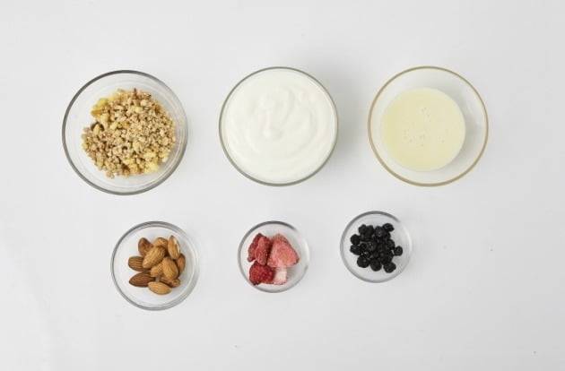 부재료 : 아몬드(10알), 딸기칩(5개), 건블루베리(10g), 그레놀라(½컵)