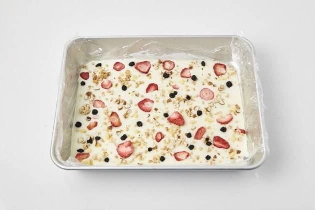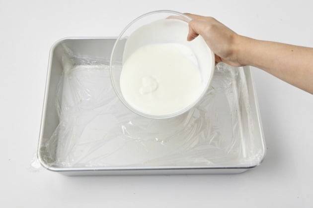 3. 넓은 판에 랩을 깔고 그릭요거트를 붓는다.