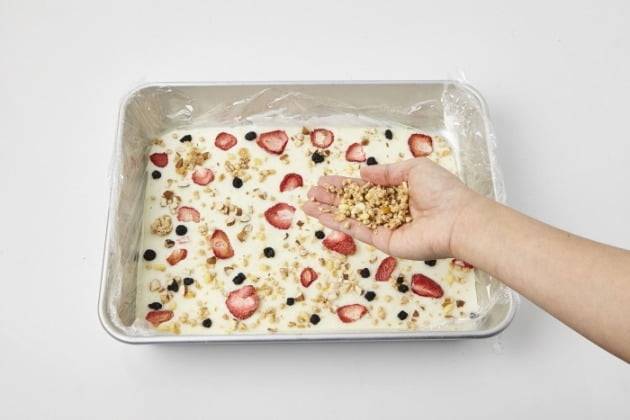 4. 딸기칩, 건블루베리, 그레놀라, 아몬드를 뿌린다.