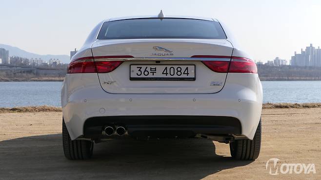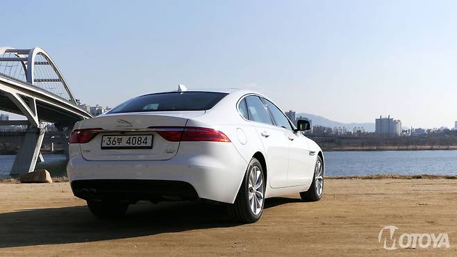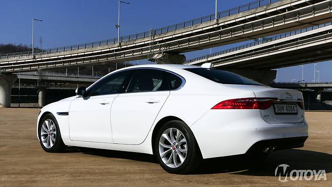 늘씬한 비례미가 일품인 측면은 여전히 우아하고 멋스럽다. XF를 비롯한 재규어 세단들은 브랜드명과 동일한 중형종 고양이과 맹수에게서 볼 수 있는 늘씬한 옆태가 특징적으로 다가온다. 완만하고도 유연한 루프라인은 늘씬한 옆태를 더욱 강조하는 요소로 다가온다. 외견 상 상당히 낮은 루프를 지니고 있기에 내부 공간이 걱정될 정도다. 뒷모습은 일견 단순하면서도 스포티한 감각이 살아 있다.