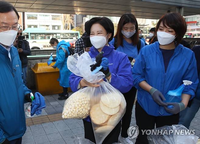 (서울=연합뉴스) 진성철 기자 = 더불어민주당 서울 동작을 이수진 국회의원 후보가 29일 서울 동작구 지하철 사당역에서 코로나19 방역 봉사활동 중 거리에서 뻥튀기를 구매하고 있다. 2020.3.29