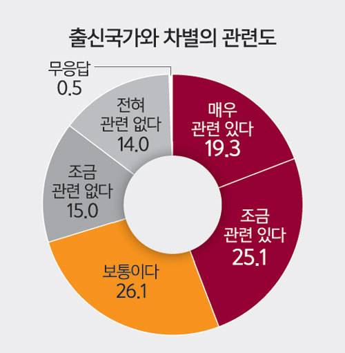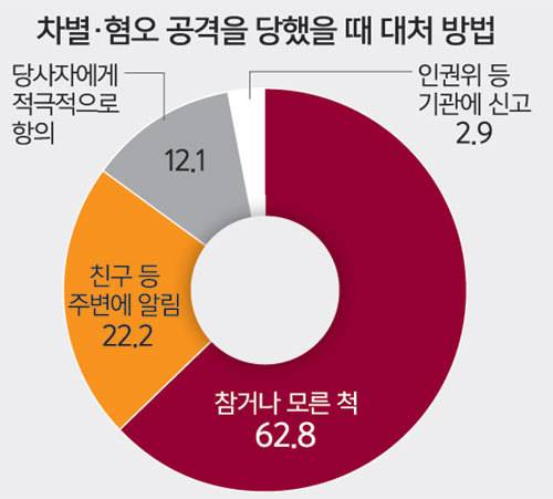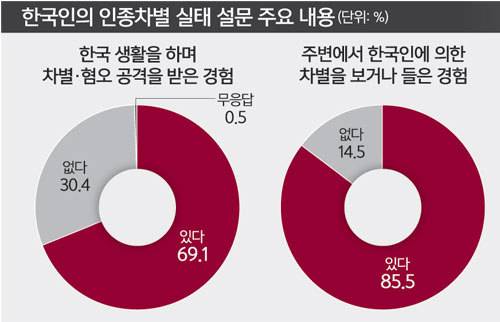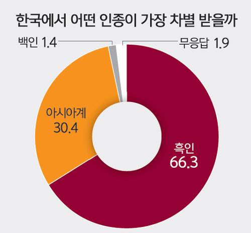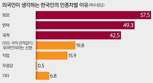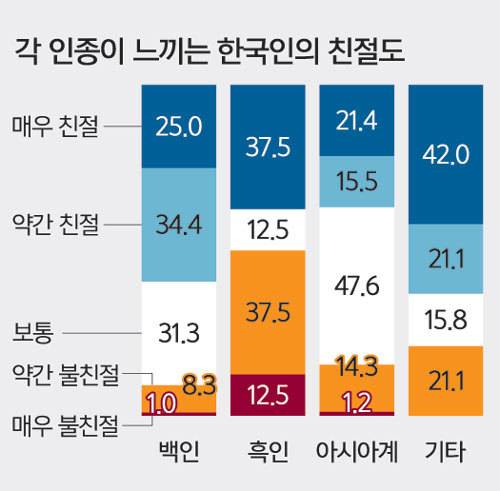 한국에 살고 있는 외국인들이 느끼는 혐오와 차별은 피부색과 출신 국가, 인종에 따라 큰 차이를 보였다. 백인들은 한국인을 ‘친절하다’고 느꼈지만, 같은 아시아계는 더 많은 불친절을 경험했다. 한국인들이 피부색은 물론 인종, 출신 국가 등에 따라 외국인을 서열화하고 계급 짓는 이중적인 모습을 보인다는 뜻이다.