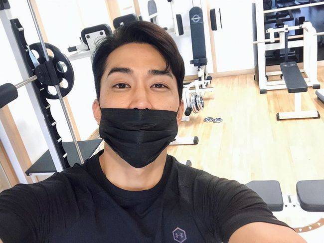 사진 속 송승헌은 헬스장에서 마스크를 쓰고 운동하고 있는 모습. 송승헌 트레이드마크인 짙은 눈썹과 오똑한 콧날, 또렷한 눈매가 돋보인다.