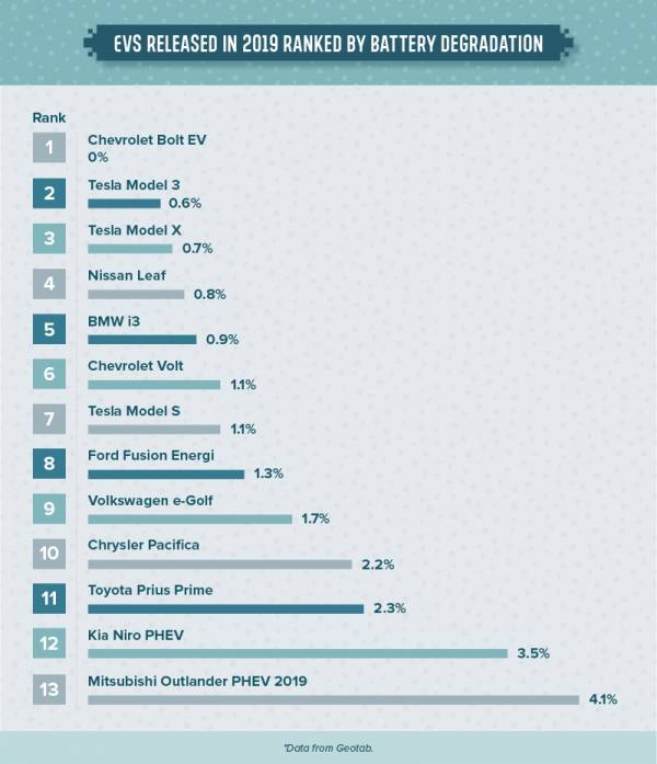 셀렉터 카 리싱이 현재 시장에 출시된 최신 전기차 모델 13개 차종의 1년 후 배터리 저장 손실량을 분석한 결과, GM(제너럴모터스) 2019년형 쉐보레 볼트 전기차는 1년이 지난 후에도 용량 손실이 전혀 발생하지 않은 것으로 나타났다.