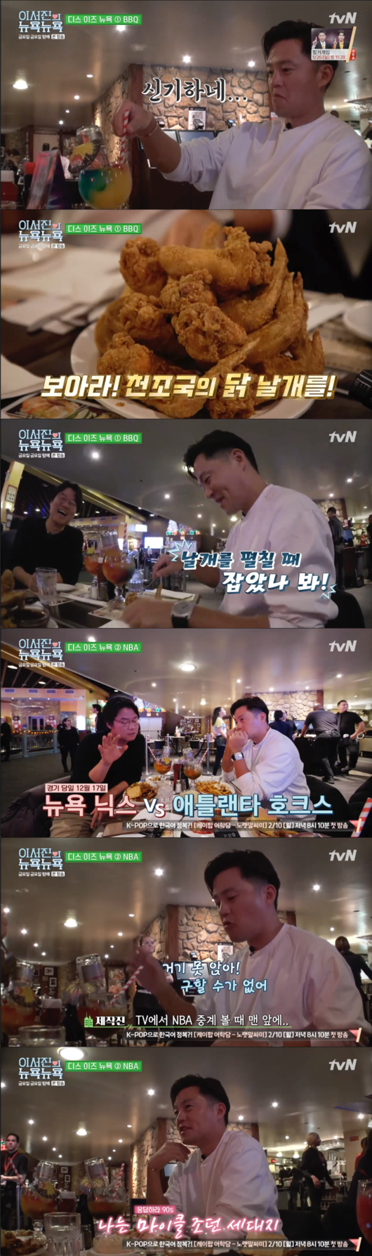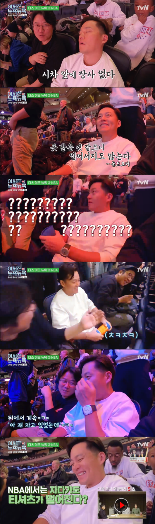 식사를 마친 이들은 뉴욕 닉스 대 애틀란타 호크스 프로 농구 경기를 보러 매디슨 스퀘어 가든으로 향했다. 비가 와서 급히 구한 티켓이었는데 이서진은 “맨 앞줄은 1000불이다. 나 때엔 못 구해서 못 봤다. 옛날에 닉스 경기 때 상대팀으로 마이클 조던이 오면 끝났다. 난 마이클 조던 세대다. 하지만 그 표를 어떻게 구하냐. 1년치 매진”이라고 알렸다.