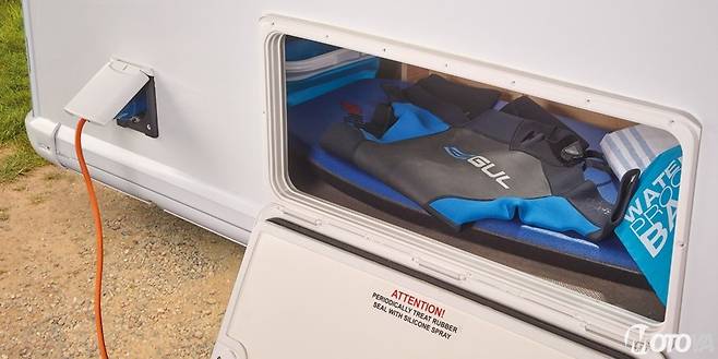 출입문은 우리나라 자동차의 기준으로 좌측(운전석측)에 위치한다. 이는 좌측통행이 상식인 영국의 환경에 따른 것이다. 출입문은 상하가 나뉘어 있는 방식을 사용하여, 반려견이나 영유아의 낙상 사고를 방지할 수 있도록 했다. 차체 전면쪽 하단에는 소파의 밑 공간을 활용한 수납공간으로 접근할 수 있는 서비스 도어가 마련되어 있다. 우측(조수석측) 역시 소파 밑 수납공간과 연결된 서비스도어가 마련되어 있고, 가스탱크 수납부와 화장실 카트리지 수납부가 자리한다.