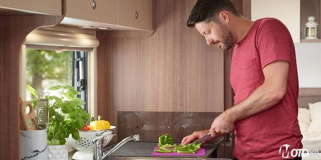 주방은 가정용에 준하는 넉넉한 구성을 자랑한다. 별도의 덮개가 마련된 싱크대와 수전은 기본에, 싱크대 상판이 넓은편이며, 싱크대 우측에는 4구 가스오븐레인지까지 설치되어있다. 상부에는 대용량의 수납장이 설치되어 있다. 가스오븐레인지의 우측에는 세로로 긴 형태의 수납장과 선반이 마련되어 있는 것을 볼 수 있다. 주방 뒤편으로는 103리터 용량의 도메틱냉장고와 소형 전자레인지가 설치되어 있다. 냉장고는 3-way 타입으로, 가스, 전기, 배터리로 모두 작동 가능하다. 전자레인지는 설치 위치가 높아, 사용이 편리하다.
