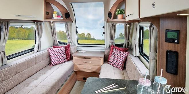 거실의 양쪽에는 두터운 쿠션을 가진 소파가 마련되어 있다. 가정집 소파처럼 편안한 착좌감을 느낄 수 있으며, 직물 커버의 질감도 우수하다. 차체 전방쪽에는 수납공간을 겸하는 협탁이 마련되어 있는 것을 볼 수 있다. 테이블은 이동식으로, 이동시에는 후방의 고정침실에 보관하다가 정박시에 꺼내서 사용하도록 되어 있다. 테이블은 높이가 충분히 높고, 크기도 넉넉하여 사용이 편리하다. 이 뿐만 아니라 거실의 협탁쪽에 붙여서 더 넓은 테이블 공간을 확보할 ㅅ 있다. 이 테이블은 밖에서도 사용이 가능하다.