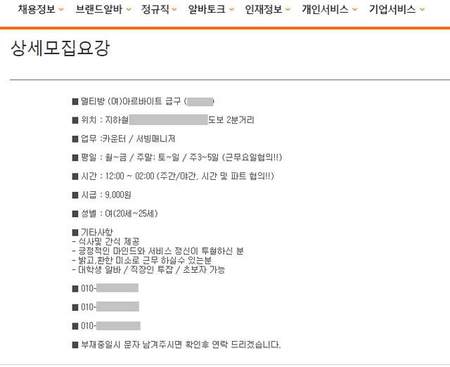 시급은 9천 원으로 최저 시급(8,590원)보다 조금 더 많았고, 근무시간은 낮 12시부터 새벽 2시까지였습니다. '긍정적인 마인드', '투철한 서비스 정신', '밝고 환한 미소'를 가진 사람을 선호한다고 돼 있었습니다. 연락처는 휴대전화 번호가 적혀 있었습니다.