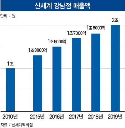 신세계 강남점은 2010년 개점 10년 만에 매출 1조원을 돌파해 ‘업계 최단기간 1조 점포’에 오르기도 했다. 이때만 해도 롯데백화점 소공점(본점)이 국내에서 유일하게 매출 1조원을 돌파한 상황이었다. 1979년 문을 연 롯데백화점 본점은 1999년 매출 1조원을 돌파한 바 있다.