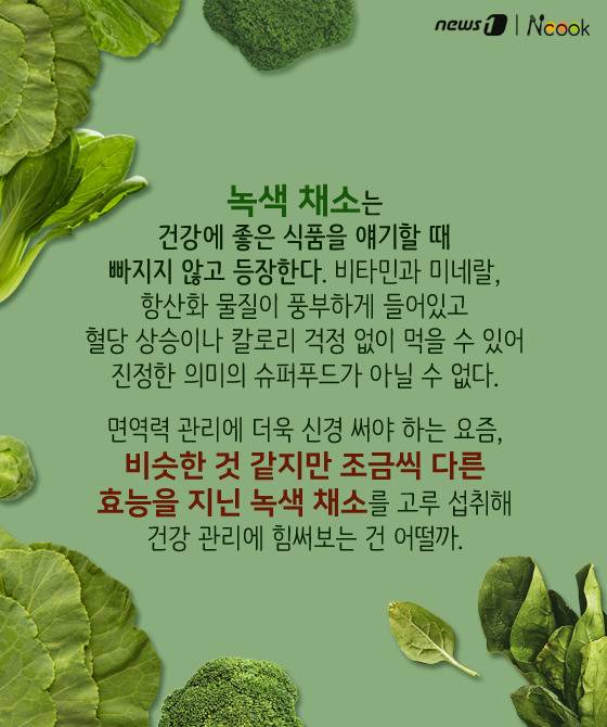 (서울=뉴스1) 박라경 에디터 = 녹색 채소는 건강에 좋은 식품을 얘기할 때 빠지지 않고 등장한다. 각종 비타민과 미네랄, 항산화 물질이 풍부하게 들어있고 혈당 상승이나 칼로리 걱정 없이 먹을 수 있어 진정한 의미의 슈퍼푸드가 아닐 수 없다. 면역력 관리에 더욱 신경 써야 하는 요즘, 비슷한 것 같지만 조금씩 다른 효능을 지닌 녹색 채소를 고루 섭취해 건강 관리에 힘써 보는 건 어떨까.