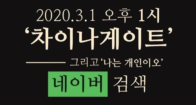 따라서 해당 글을 올린 이들은 “투명한 대한민국을 위해 이제 우리 모두가 힘을 모을 때”라며 “중국의 여론강점기, 깨어있는 대한민국 국민의 힘으로 광복합시다”라고 강조한다. 그러면서 3월 1일 오후 1시 ‘차이나게이트’, ‘나는 개인이오’를 네이버 실시간 검색어에 올리자고 제안했다.