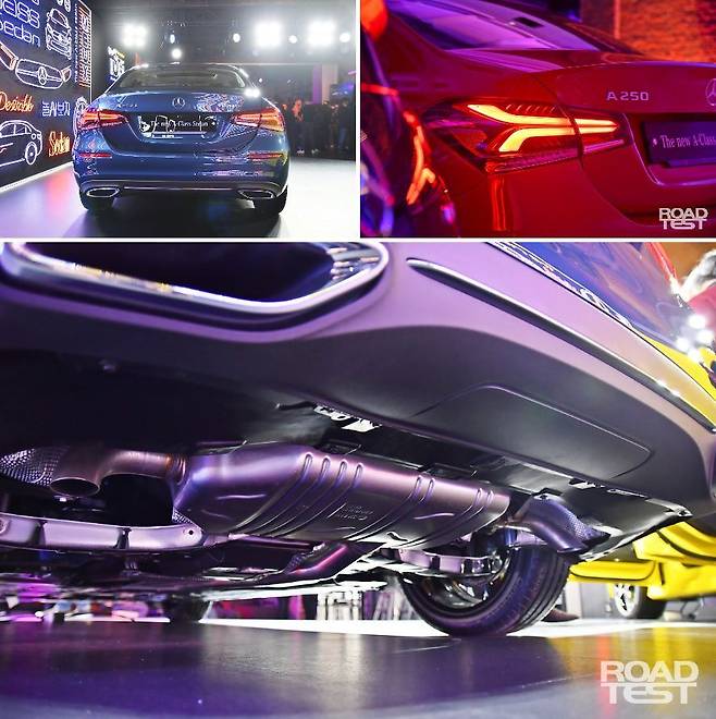 뒷모습도 쿠페형 세단임을 강조한다. 테일램프를 보다 얇게 빚고 끝엔 각을 세웠다. 또한 번호판을 트렁크에서 범퍼로 내렸다. 범퍼 양쪽엔 배기구가 자리했지만 A-클래스 세단처럼 모두 가짜다. 휠은 A250 4MATIC의 18인치 휠과 디자인이 같지만 타이어가 콘티넨탈 Ecocontact 6로 CLA 이미지와는 거리가 있다.