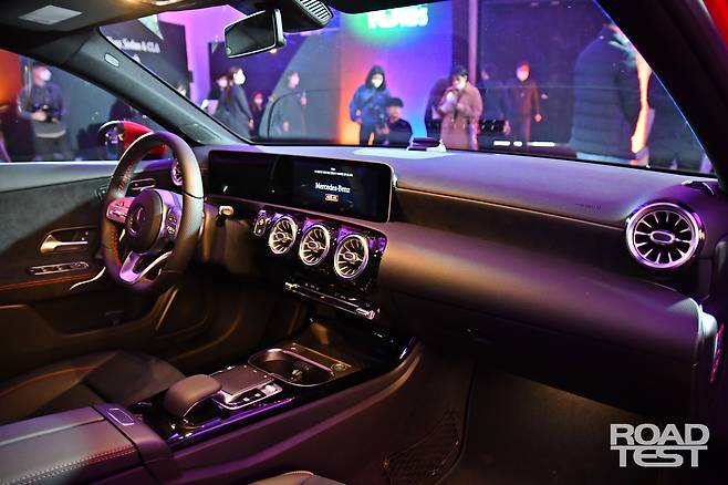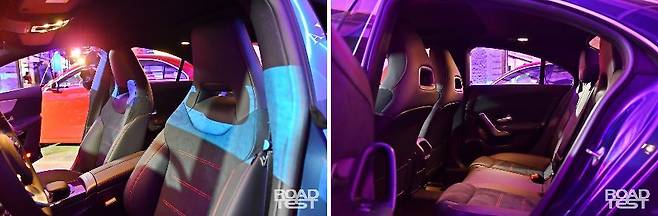 실내도 D컷 스티어링 휠을 쓰는 등 A-클래스(A250 4MATIC)와 같다. 그러나 AMG 라인이 기본으로, 대시보드 위까지 레드 스티치가 들어갔다, 시트는 등받이와 헤드레스트가 이어진 세미 버킷시트다. 풀 버킷 시트가 아니라 등받이 조절을 할 수 있다. 또한 동승석 시트는 수동식이 아닌 전동식이다.