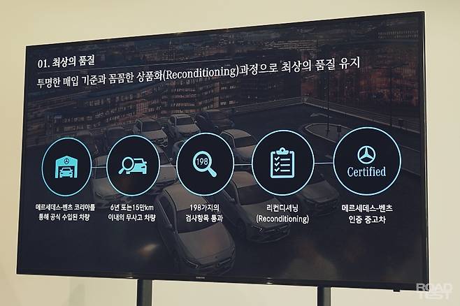 벤츠 인증 중고차는 1. 입고 > 2. 육안 평가 및 검사 > 3. 성능, 상태 점검 > 4. 품질 검사 > 5. 최종 점검 및 상품화 요청내역 확인 > 6. 상품화 등 총 6 단계 엄격한 과정을 거친다.