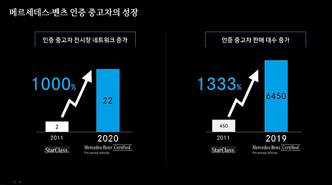 벤츠 코리아는 지난 2011년 ‘스타클래스 인증 중고차’ 브랜드를 선보였다. 11일 벤츠가 공개한 자료에 따르면 2019년 판매대수는 무려 6,450대로 첫 해 대비 약 13배 성장했다. 코로나19 영향을 받은 올해는 5월 까지 3,140대를 출고했다. 중고차 전용 전시장은 2곳에서 22곳으로 10배 늘었다.