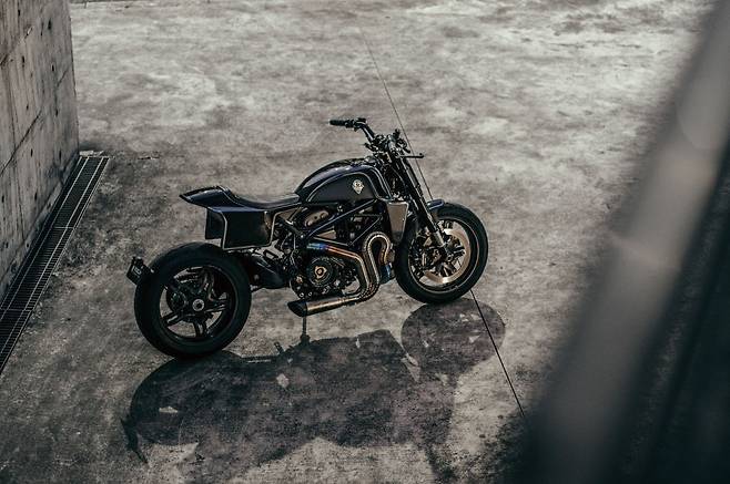 러프크래프트 윈스턴 예(Winston Yeh)가 보여준 트래커 스타일의 까만 커스텀 바이크는 한눈에 베이스 모델을 알기 어려웠다. 그는 (그럴 줄 알았다는 듯) ‘씨익’ 웃으며 “두카티 하이퍼모타드!”라고 대답했다. 다시 보니 그제야 화려한 매니폴드의 존재감에 가려진 L트윈 엔진과 블랙으로 칠해진 트렐리스 프레임이 눈에 들어왔다.