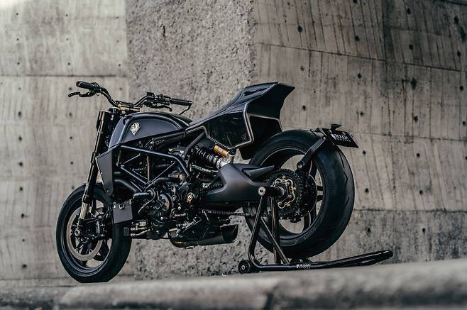 이 스타일로 꾸미게 된 계기가 재밌다. 바이크의 오너는 하이퍼모타드에 반해서 구매했지만 막상 타이페이 시내의 막히는 도로에서 달려보니 870mm의 높은 시트고가 큰 스트레스였다고 한다. 하지만 업라이트 포지션 주행 스타일이 만족스러웠기 때문에 그에게 작업을 의뢰할 때 포지션을 유지하면서 높이를 낮추고 새로운 스타일로 주문했다고 한다. 그래서 트래커 스타일임에도 17인치 휠 사이즈를 유지시켰고 차고를 낮추기 위해 수많은 스케치와 시뮬레이션 작업을 거쳤다.