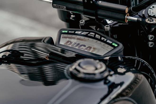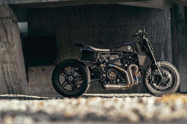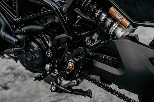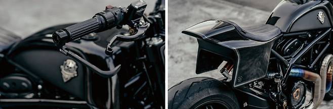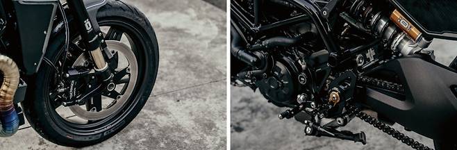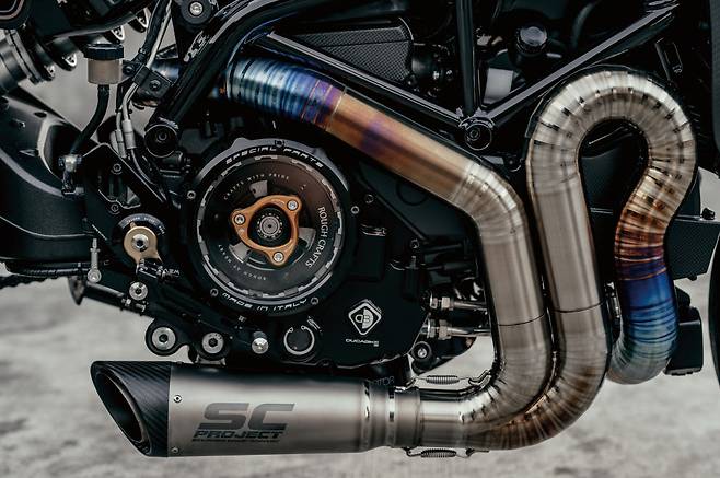 정교한 용접비드와 티타늄의 오묘한 컬러, 마치뱀이 또아리 튼 것 같은 굴곡이 매력적인 배기시스템은 트론 레이싱에서 제작한 매니폴드에 SC 프로젝트 소음기를 조합했다. 이렇듯 러프크래프트는 다양한 브랜드 협업을 통해 단순한 커스텀 바이크 작업을 넘어 브랜드 사이에서 콘셉트 모델과 프로토타입의 역할을 하고 있다.