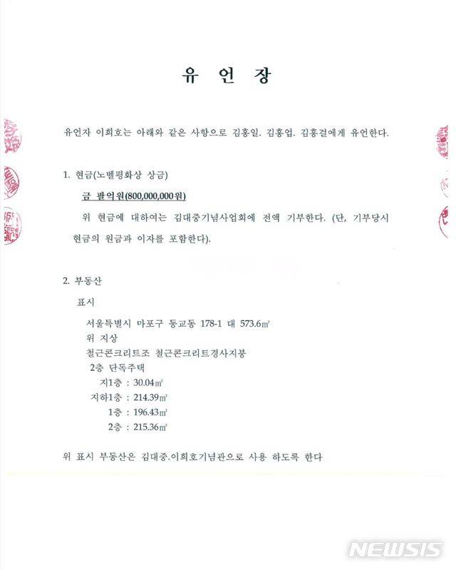 김홍업 이사장은 이날 입장문을 내고 “김홍걸 의원은 24일 기자회견에서 이희호 여사 유언장 관련 내용이 거짓임을 스스로 드러냈다”고 했다. 그러면서 이희호 여사의 유언장과 합의서를 공개했다.