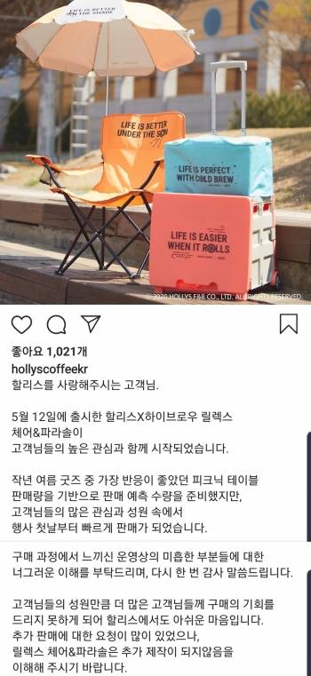 지난 12일 출시한 할리스X하이브로우 릴렉스 체어&파라솔은 출시 첫날 오전에 매진될 정도로 인기를 끌었지만 소비자들의 원성을 들어야 했다. 판매예고가 올라오자마자 이슈가 됐음에도 불구하고 물량을 충분히 준비하지 못했고 매진 된 후에도 할리스 측에서 추가제작 계획이 없다고 밝히면서다. 1만5900원(1만원 이상 제품 구매시)에 구입할 수 있었던 할리스 릴렉스 체어는 현재 중고거래 사이트에서 5~6만원 선에 거래되고 있다. 최고 10만원까지 가격을 책정한 리셀러도 등장했다.