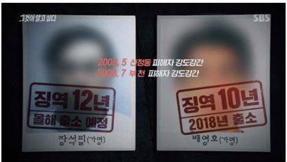 방송에 따르면 2008년 장씨는 신정역 부근에서 술 취한 여성을 보고 뒤따라가서 친구 배씨를 불러냈다. 여성이 문을 잠그지 않고 잠이 들자 뒤따라 들어가 성폭행을 시도했다. 피해자가 반항하자 샴페인 병으로 피해자 머리를 때리고 피해자의 카드로 250여만 원을 인출한 것. 이 사건으로 검거된 장씨는 징역 12년을 선고받고 올해 출소 예정이며 배씨는 징역 10년을 선고받고 2018년 출소한 상태였다.