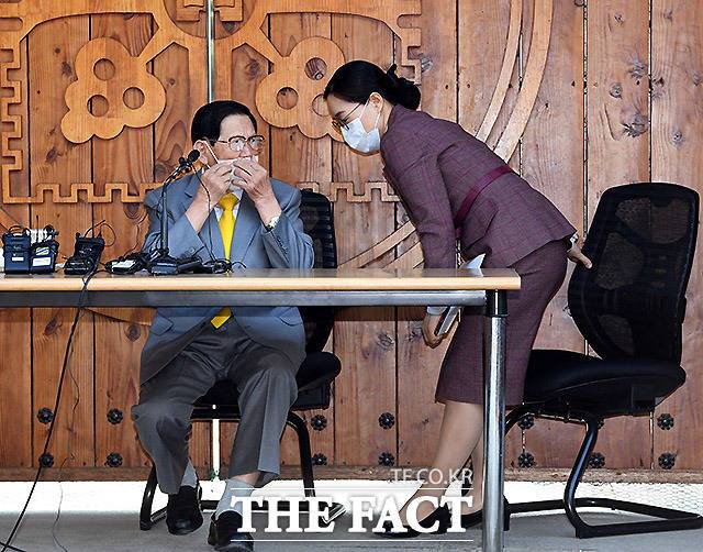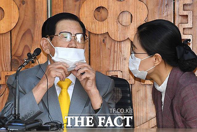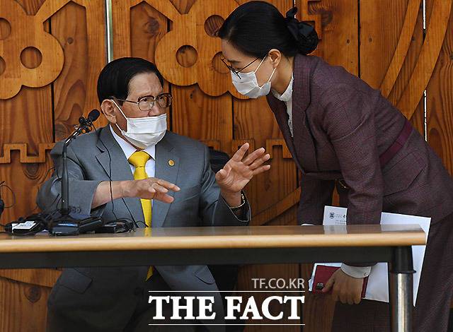 [더팩트ㅣ이효균 기자] 이만희 신천지예수교 증거장막 성전 총회장이 2일 경기도 가평 신천지 연수원에서 기자회견을 연 가운데 이 총회장의 귀 역할을 한 신천지 교인 김평화 씨가 이 교주만큼 주목을 받고 있다.