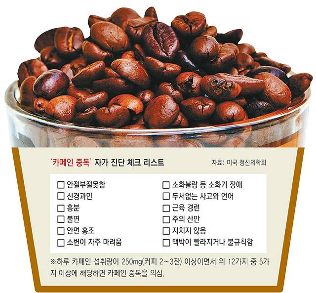 지속적인 카페인 섭취는 의학적으로 ‘카페인 중독’에까지 이를 수 있다. 미국 정신의학회의 정신장애진단통계편람(DSM)에 따르면 육체적, 정신적 질환이 없고 하루 카페인 섭취량이 250mg 이상인 사람이 다음 12가지 증상 중 5개 이상에 해당하면 카페인 중독이 의심된다. 기준은 △안절부절못함 △신경과민 △흥분 △불면 △안면 홍조 △소변이 자주 마려움 △소화불량 등 소화기 장애 △두서없는 사고와 언어 △근육 경련 △주의 산만 △지치지 않음 △맥박이 빨라지거나 불규칙함 등이다.