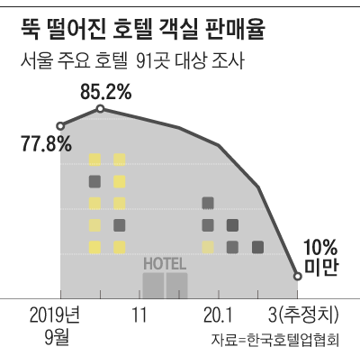 국내 호텔업계가 빈사 상태에 빠졌다. 외국인 입국 제한 조치로 관광객 발길이 뚝 끊겼고, 국내 여행 수요도 급감했다. 작년까지 70%를 오르내리던 호텔 객실 판매율은 3월 들어 10%대로 급전직하했다. 코로나발(發) 이용객 급감은 특급 호텔, 중소 호텔을 가리지 않고 덮치고 있다.