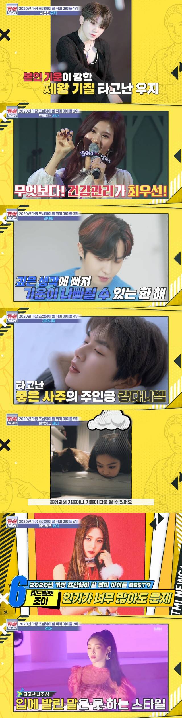 6위는 인기가 너무 많아도 문제라며 레드벨벲 조이가 언급됐다. 전문가는 “사주부터 도화인데 관상도 도화다. 이분은 진정한 연예인 사주다. 한 남자의 여자보다 만인의 여자가 될 사주다”라며 “이성과의 스캔들로 구설수가 심해질 수 있는 해다. 올해는 자신의 의견을 피력하다보니 마찰이 생길 수 있다. 구설수가 있더라도 돈 복이 좋고 본인이 마음먹으면 다 성공할 사주다”라고 말했다.
