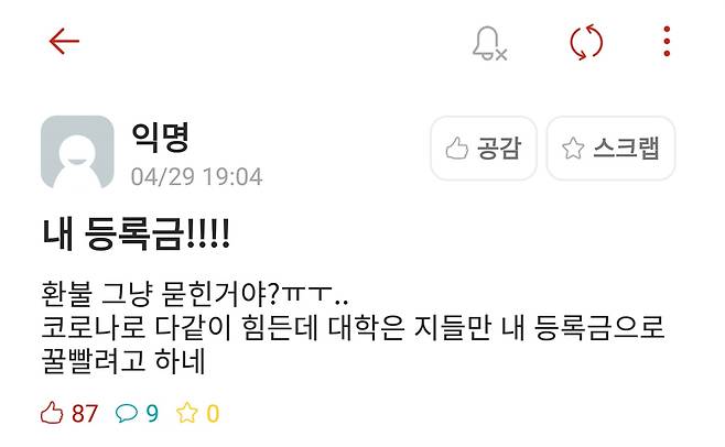 | ▲ 내 등록금!!!! 대학 커뮤니티 에브리타임에 등록금을 환불해달라고 한 학생이 쓴 글이다 많은 공감을 얻어 뜨거운 반응을 얻어냈다 |