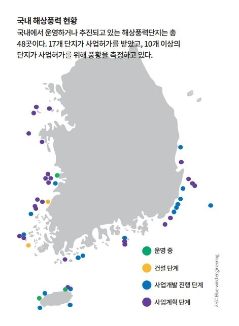 산업통상자원부도 2019년 12월 4차 에너지 수급 계획을 발표하며 해상풍력을 주요 발전원으로 꼽았다. 해상풍력 컨설팅 업체인 블루 윈드 엔지니어링에 따르면 현재 해상풍력발전은 제주와 서해에서 총 3곳이 운영 중이며, 2019년 11월 준공한 서남해 실증단지까지 포함하면 조만간 4곳이 운영된다. 이 밖에도 사업허가를 획득한 17곳을 포함해 총 44개 지역에서 해상풍력발전 계획이 논의되고 있다.