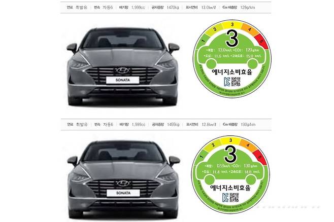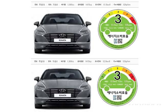 기존 쏘나타 2.0 가솔린 17인치 휠의 복합연비는 13.3km/ℓ다. 도심은 11.9km/ℓ, 고속도로는 15.5km/ℓ다. 2020 쏘나타 2.0의 17인치 휠 복합연비는 12.9km/ℓ(-0.4), 도심 11.6km/ℓ(-0.3), 고속도로 14.8km/ℓ(-0.7)다. 고속도로에서의 연비 하락 폭이 크다.