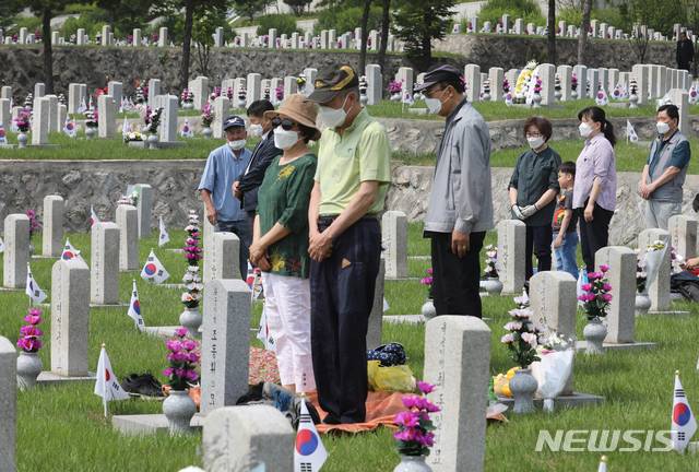 [서울=뉴시스]김명원 기자 = 제65회 현충일인 6일 오전 서울 동작구 국립서울현충원에서 유가족들이 오전 10시 사이렌이 울리자 순국선열에 대한 묵념을 하고 있다. 2020.06.06.