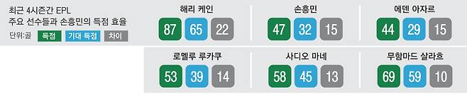 손흥민은 최근 4시즌 동안 리그에서 47골을 넣었다. 그런데 이 기간 기대 득점(한 팀 또는 선수가 생산한 찬스를 세밀히 측정한 뒤 이를 토대로 기대 가능한 골을 예측하는 분석)은 32골에 불과했다. 손흥민은 이보다 무려 15골을 더 넣었다. 기대 득점보다 실제 득점이 손흥민보다 많았던 선수는 토트넘 동료인 해리 케인(22골)뿐이었다. 사디오 마네(13골), 무함마드 살라흐(10골·이상 리버풀)도 손흥민에는 미치지 못했다. 손흥민이 토트넘을 넘어 EPL 최고 공격수 반열에 올랐다는 증거다.