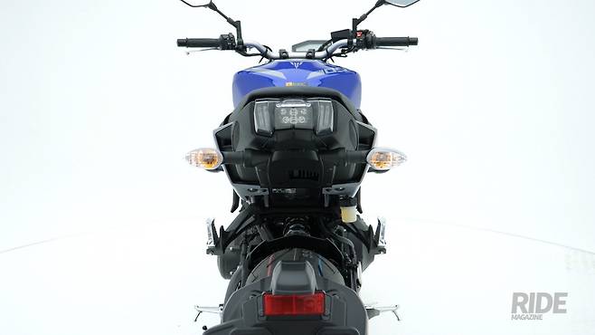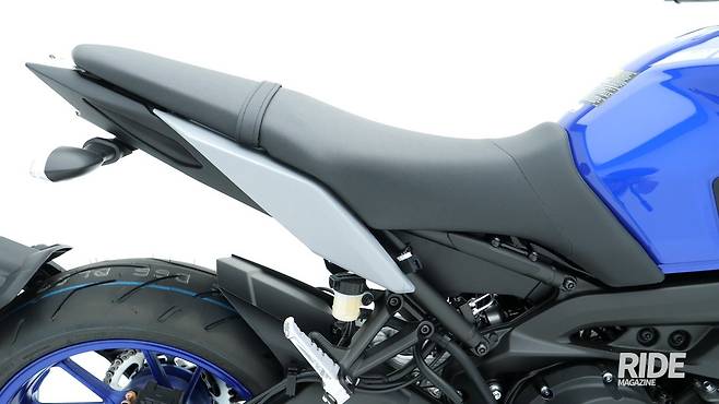 시트는 2인 승차 일체형이다. 길게 뻗어 전후 움직임이 자유롭고 좌우 너비가 넉넉한 편이라 장거리 투어를 가도 불편함이 없는 크기다. 시트 앞쪽은 좁게 설계되어 발 착지성을 고려했다. 시트 높이는 820mm로 네이키드 바이크 치고는 약간 높은 편이다.