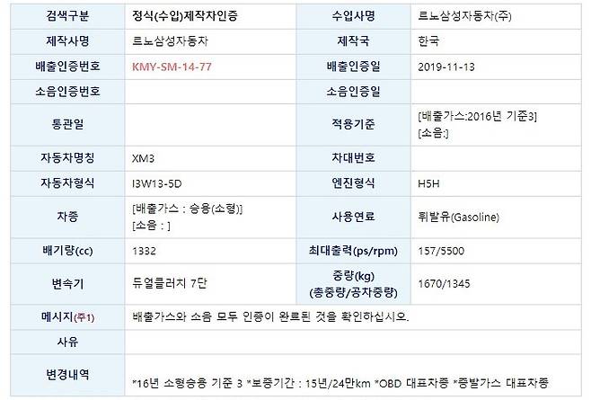 파워트레인은 앞서 인증 자료를 통해 공개됐다. 국립환경과학원 교통환경연구소 자동차 배출가스 및 소음인증 시스템(KENCIS)에 따르면 XM3는 이미 지난해 11월 배출가스 및 소음 인증을 마쳤다.