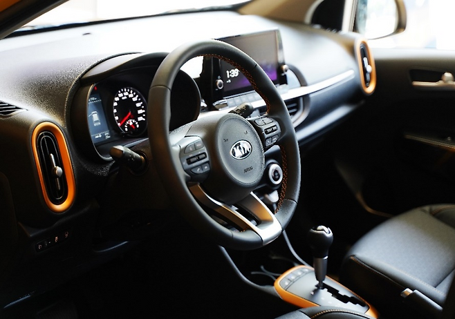 블랙 원톤에 오렌지 컬러로 포인트를 더한 실내는 보기 좋았다. 좌우 에어컨 송풍구와 기어 레버, 시트, 도어트림, 센터 콘솔 등 인조가죽 소재 곳곳에 전용 색상과 스티치를 촘촘히 더했다. 앞 좌석 도어트림에 적용된 홀로그램을 떠올리는 디테일은 전과 같지만, 오렌지 컬러를 사용해 더 화려해 보인다. 올 뉴 모닝에는 레드와 라임 컬러로 같은 사양이 적용됐다.