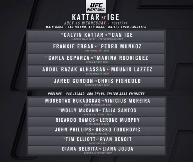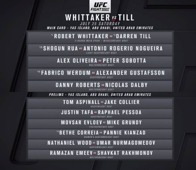 다음 달 12일부터 26일까지 아랍에미리트 아부다비 '파이트 아일랜드' 야스 섬에서 보름 동안 펼쳐질 UFC 전 경기가 발표됐다. 4개 대회에서 타이틀전 4경기를 포함해 총 47경기가 펼쳐진다.