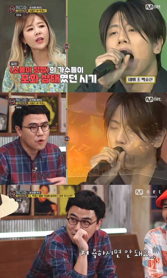 배순탁 역시 “사실 나 역시 박효신을 처음부터 눈여겨 보지 않았다. 그냥 소몰이 창법을 사용하는 가수 중 한명이라고 생각했다. 그런데 정규 4집부터 서서히 변하더니 ‘눈의 꽃’을 통해 눈여겨보게됐다. 이후 ‘야생화’가 수록된 7집에서는 왕이 됐다”고 공감을 표했다. (사진=Mnet ‘퀴즈와 음악 사이’ 캡처)