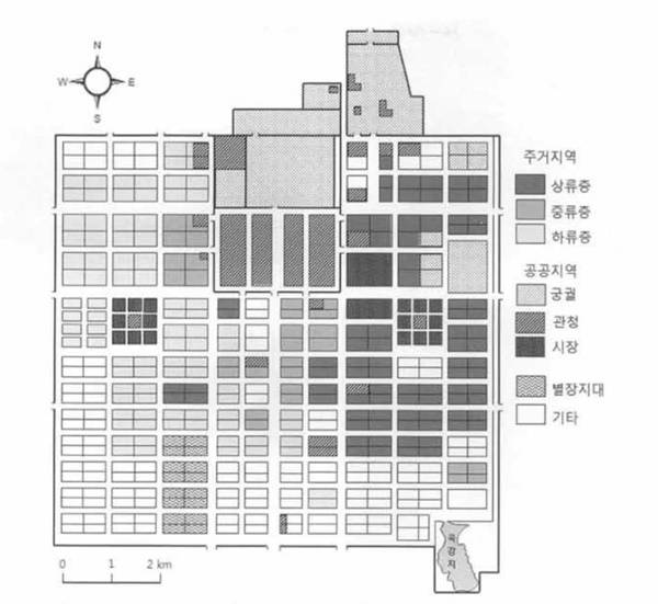이렇게 본성과 성곽 내부에 각자의 구역을 정리하여 비슷한 계층끼리 모여 살았는데 성곽 외부에도 민가들이 있었다. 대부분 천민계급에서도 최하층으로 취급받는 백성들이 성 밖에서 농사를 지으며 살았다. 천민을 백성 취급하지 않은 것은 인격권에 분명 문제가 있지만 당시의 정치 세계관이 그러했던 것일뿐이며 대다수의 백성들은 성벽으로 둘러싸인 도성 안에 기거하는 형태를 취하고 있었고 이것이 한국의 과거 주요 도시 구성체였으며 행정단위의 기본으로 정착됐다.