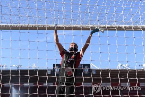 epa08508992 Ground staff disinfect the goal bar before the English Premier League match between Southampton FC and Arsenal FC in Southampton, Britain, 25 June 2020. EPA/Mike Hewitt/NMC/Pool EDITORIAL USE ONLY. No use with unauthorized audio, video, data, fixture lists, club/league logos or 'live' services. Online in-match use limited to 120 images, no video emulation. No use in betting, games or single club/league/player publications.